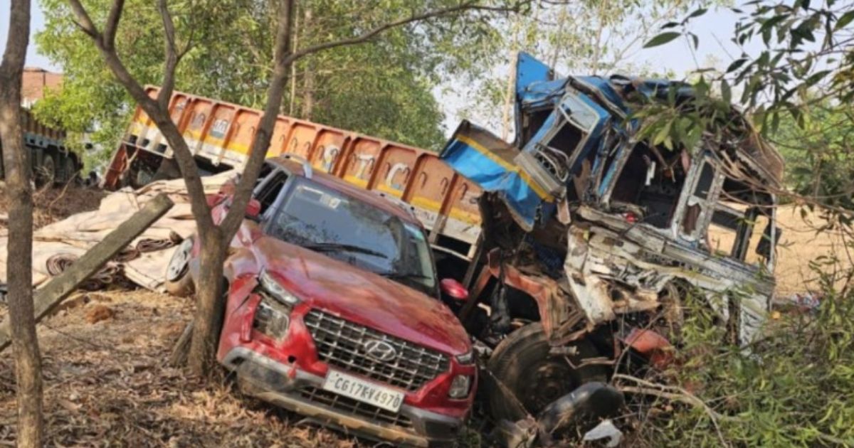 छत्तीसगढ़ में भीषण सड़क हादसा : टिप्पर-ट्रक की जबरदस्त टक्कर, बीच में फंसी कार; 1 की मौत, 6 लोग घायल