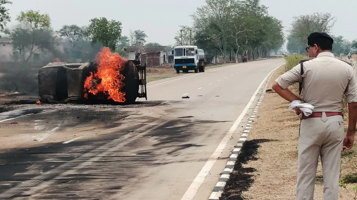 धमतरी : धमतरी हाईवे पर बड़ा हादसा टला: डीजल टैंकर पलटा, आग लगने के बाद समय रहते काबू पाया गया